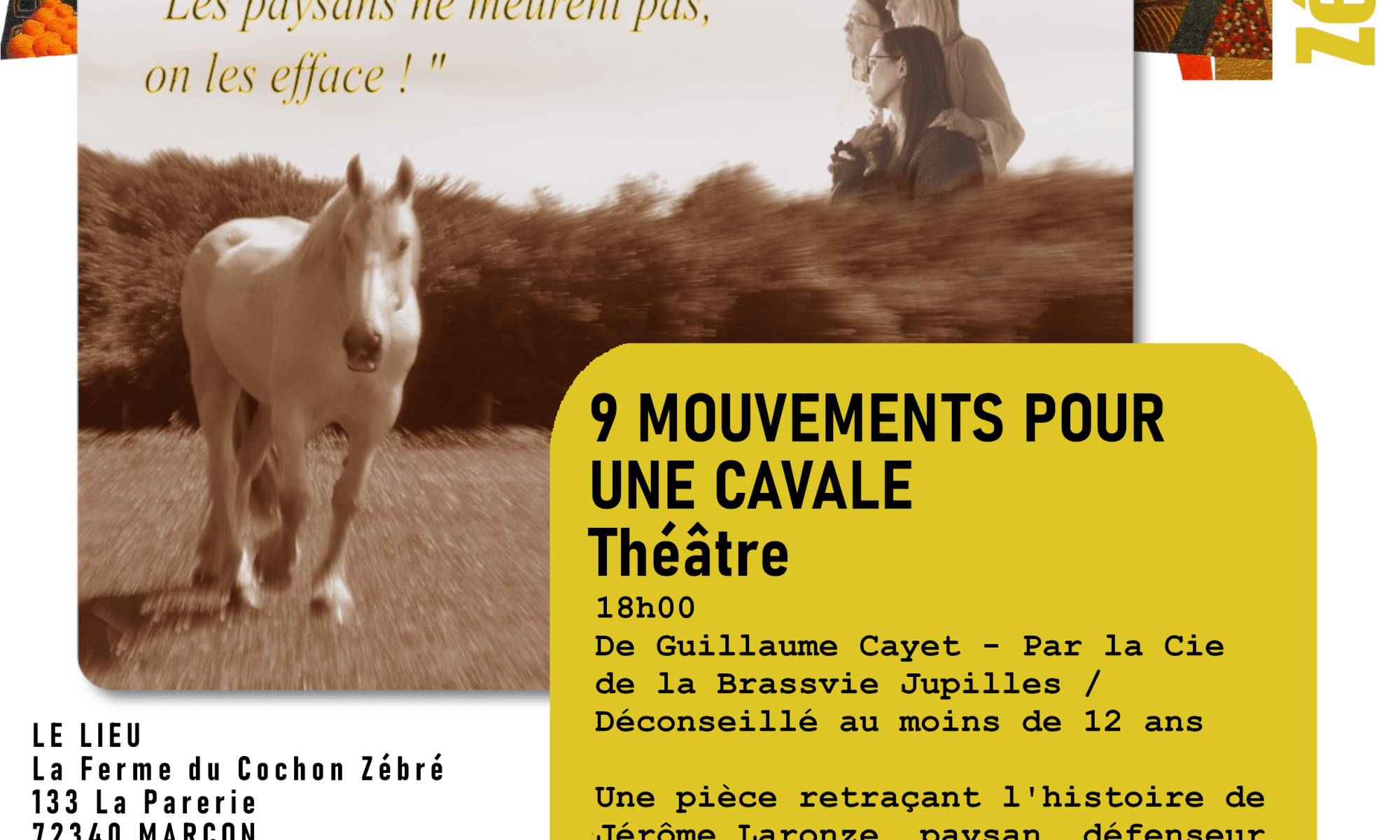 – Cette pièce, présentée en Sarthe par une troupe amateur, fait suite au retour de Bourgogne de l’un de ses comédiens. Ses rencontres avec plusieurs des protagonistes lors des rassemblements qui avaient lieu (et ont toujours lieu) les 20 de chaque mois à Mâcon (Saône-et-Loire), commémorant ainsi la mort de Jérôme LARONZE, l’avaient alors fortement marqué. De fait, en mai 2017, la nouvelle de la mort de Jérôme avait produit une onde de choc dans les réseaux locaux de défense de l’environnement du sud Bourgogne, pour s’élargir ensuite.
