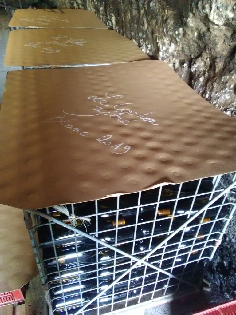 Pour mon Blanc 2019, j’ai décidé de le filtrer sur terre pour retirer les éléments les plus grossiers, les colloïdes. Puis je l’ai mis en bouteille en le filtrant encore un peu plus serré parce qu’il présentait un risque de refermentation en bouteille. Cela peut arriver. Les levures n’ont pas consommé tout le sucre et les bactéries lactiques n’ont pas procédé à la fermentation malolactique (2e fermentation après la fermentation alcoolique qui crée l’alcool). Et des bactéries qui décideraient de se remettre au boulot aidées par le sucre …. ben ça fait des bulles et des bouchons qui sautent ! Mais pas de ça chez le Cochon Zébré, j’ai donc choisi un filtration qui élimine les bactéries.