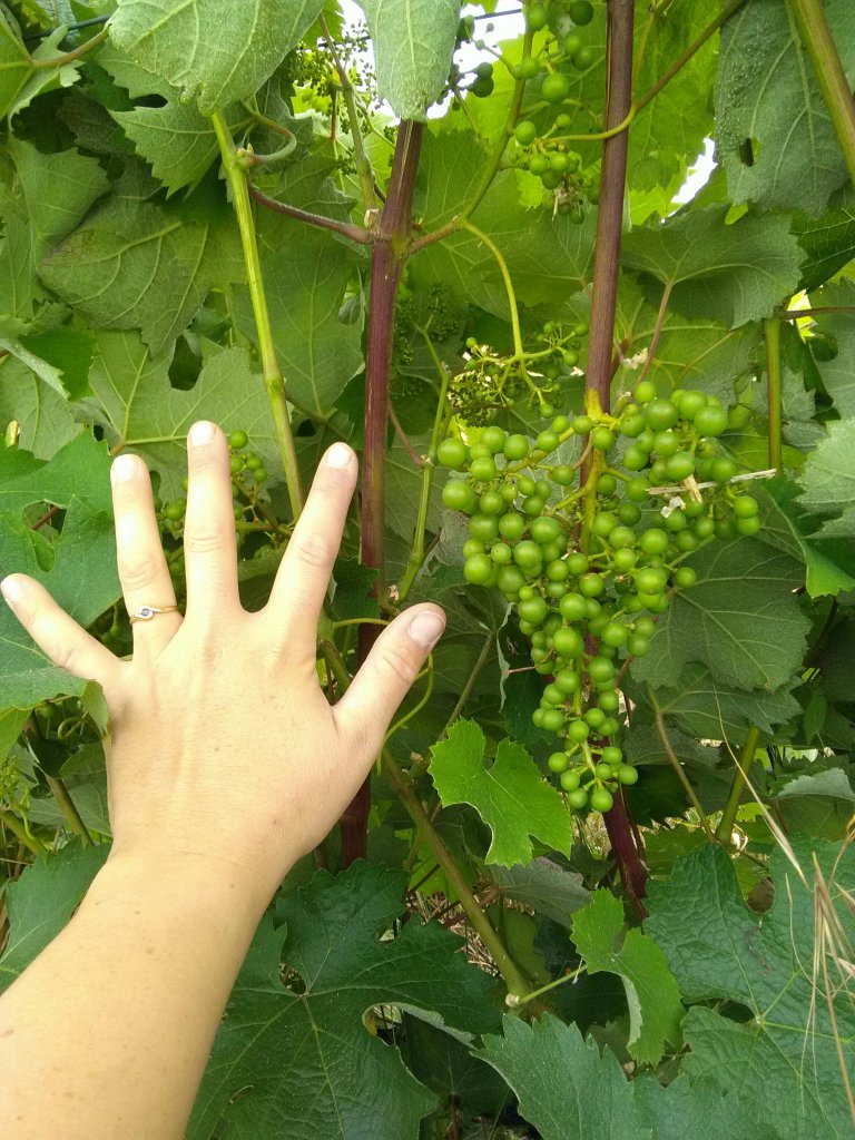 Les raisins grossissent tranquillement et sainement. Les températures plus fraîches ne précipitent pas leur croissance. Le vignoble est indemne de maladie. Je suis occupée à palisser les vignes (maintenir la végétation entre les fils) et à travailler les sols pour limiter l’enherbement afin que ce dernier ne vienne pas concurrencer la vigne.