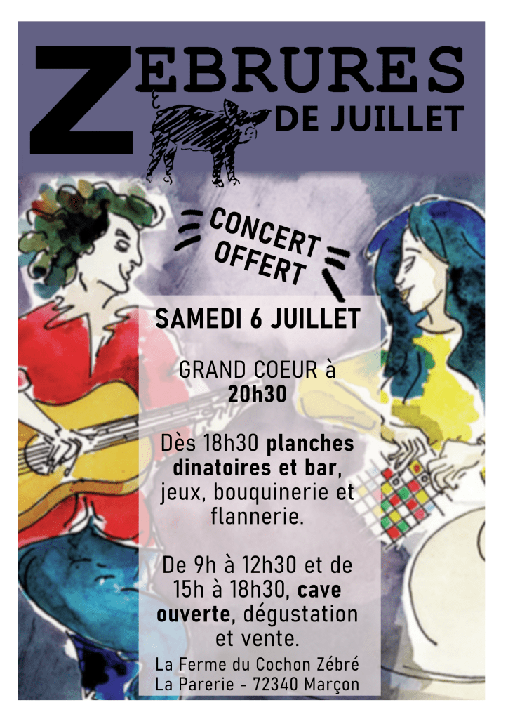 Nouvelle zébrure vendredi 2 mai à partir de 19h30 ! Cette fois ci nous retrouvons le charme de la cours de la cave pour une soirée concert et dîner sous les étoiles !